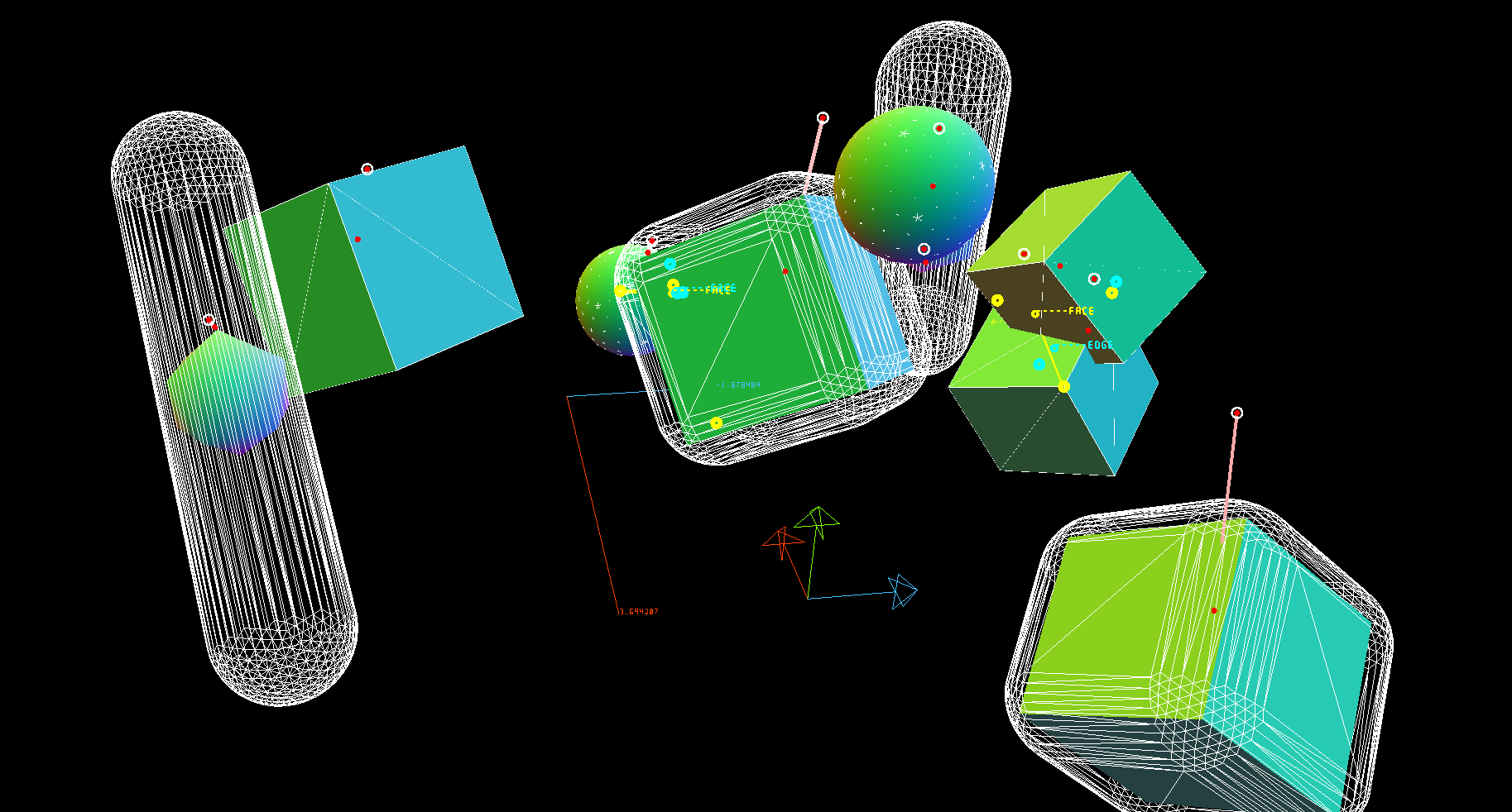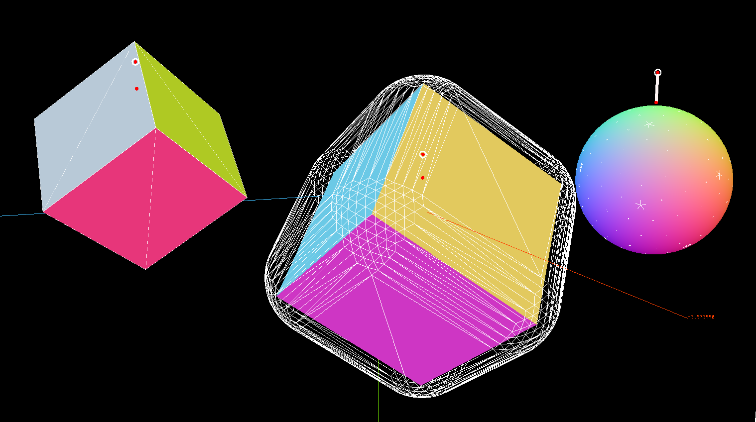 In this shot, three different geometries were meshed using this method - they are drawn using white wireframes. A cube, a sphere, and a sphere-swept cube (which is just the Minkowski sum of the two). The wireframe for the plain old sphere is mostly masked by its non-debug mesh in this picture :P